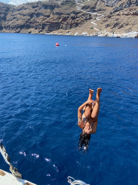 Techno pop blared on the boat’s speakers, only lowering when one of the crew addressed us.  Within the first half hour, Natalia told us that there was going to be a competition on board.  The challenge was to take photos and post them onto Instagram in real time. Whoever posted the best photo would win…none other than…a bottle of Santorini wine! We chuckled, while others cheered and within minutes, the twenty somethings had their phones out snapping pics of themselves and the scenery.  At this point I couldn’t help but notice, we were the only ones without tattoos.  Birds, flowers, a lion, quotes and even an astronaut were inked onto the youthful tanned skin of the guests and crew.