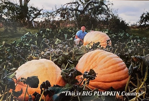 I still have the postcard I bought while exploring the Bay of Fundy and Annapolis Valley where we indeed visited the Dill farm in the town of Windsor. Howard Dill, its owner until his passing in 2008, was a full-time farmer and self-taught plant genetics scientist. He was also a world champion pumpkin breeder who patented his “Atlantic Giant” variety in 1979. After spending years tweaking and perfecting a line of super heavy-weight pumpkins, Dill took top honors in an international pumpkin weigh-off with an impressive 439-pound specimen which also earned him the title “King of Pumpkins”.