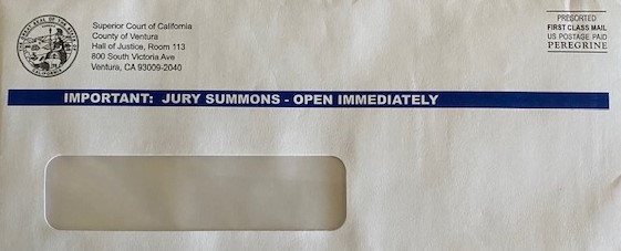 Now four weeks ago, however, I received something quite different. Something unlike my happy-to-see-you pieces. What it was, was, an official looking envelope, plain white, with a small cellophane window in which my name appeared. My full name, first, last, and even middle! There was a round black seal in the upper left-hand corner with a return address that I know is located 20.8 miles away. The thick blue line inked across its upper portion contained 35 letters and two punctuation marks all in white caps. They alerted me to the fact that my yearly friend was calling on me again. The letters spelled it out simply and concisely. IMPORTANT: JURY SUMMONS – OPEN IMMEDIATELY.
