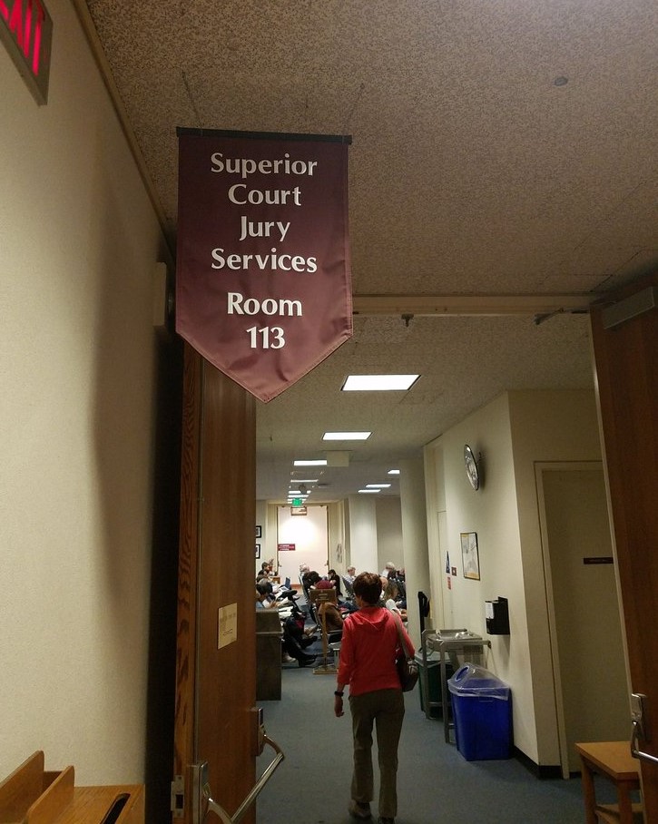 Parking in Lot A, I stepped through the front door of the Hall of Justice a half hour before our duty was to officially begin. Through Security in no time, I was fifth in line to enter the jury room. Due to the pandemic, I quickly caught on that the procedures had changed. First, I didn’t have to sit in the crowded rows of seating – I was “assigned” a whole table – to myself! Second, we were told no one was allowed to talk on their phone in the jury room. I wouldn’t be needing my ear plugs after all! Third, drinks with lids were okay now, as well as small snacks at our seats. I had everything in reach! And the best news of all? Jurors now only have to be present for four hours instead of a full day. Bonus!