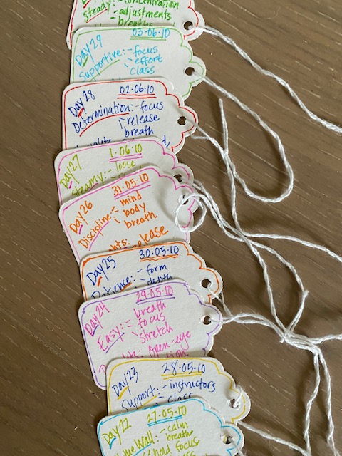 Unlike others bold enough to announce their intentions in class and out, I kept mum. I told Robert, of course, but no one else until halfway through my trek. Maybe I was worried that I physically couldn’t last the duration. Maybe I thought it was a personal journey, not meant from shouting from the rooftops. Maybe it was the accountability factor. I just know I stayed quiet and journaled daily about my experiences. I even made a little project out of it, writing the day, date, feelings, and thoughts I had after each session on a little white tag that I planned to assemble into a collage when I had completed the final day. Such great expectations!