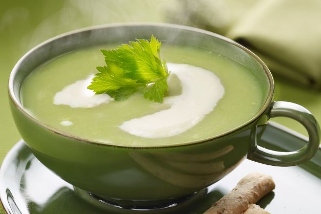 3. Working in batches, puree soup until smooth. (To prevent splattering, fill blender only halfway, and allow the heat to escape: Remove cap from hole in lid; cover lid with a dish towel, holding down firmly while blending.) Return soup to pan; stir in lemon juice, and season with salt. Serve, garnished with celery leaves.
