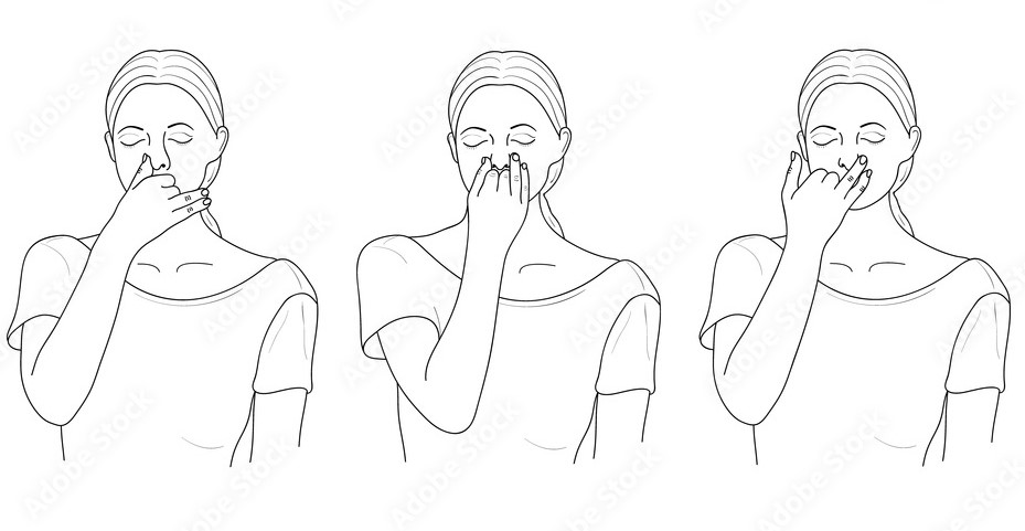 - Bring your right hand to your nose, pressing your first and middle finger to your palm, leaving your other fingers extended.