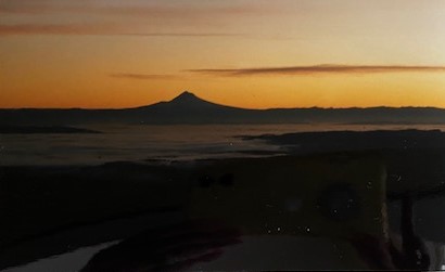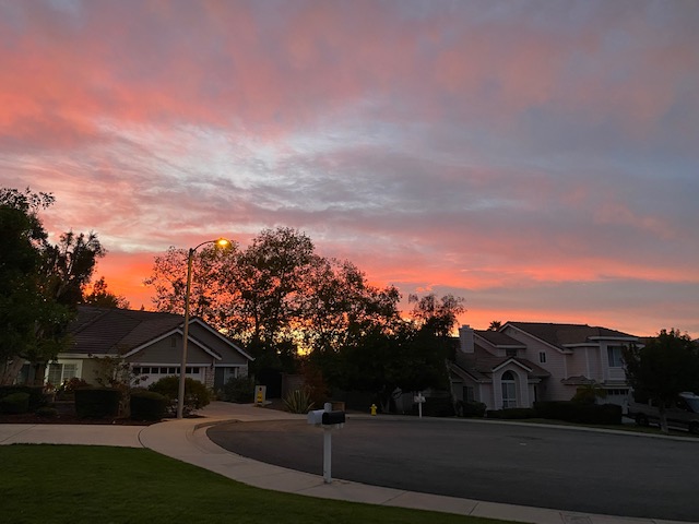 “Clear, cool, blue gray Monday…it’s beautiful outside looking out over the orchard and valley. The fog rolls in and out. The sun is peeking through the clouds…the sky is an apricot color…gorgeous!”