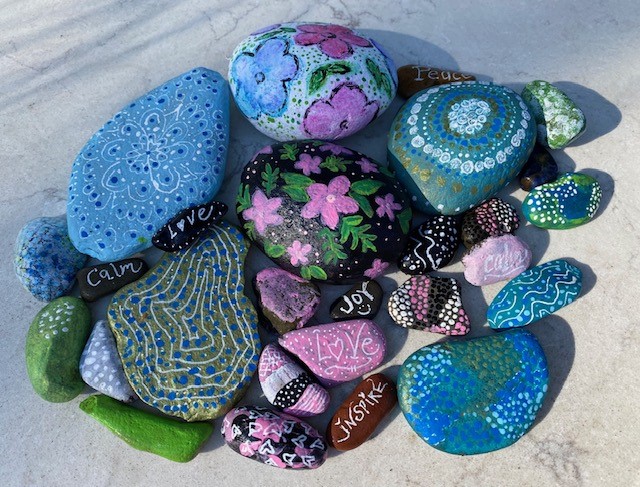 Painting rocks just about every day, I now have a colorful kaleidoscope in my collection. Some I will put back into my Zen Garden, others I will place around our neighborhood, and a few I’ll keep close by to have and to hold whenever I need to step back a moment and take a breather.