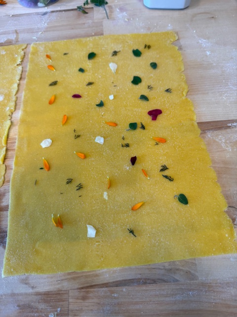 With aprons on and standing at our stations, we watched her demonstrate each step then we followed suit. Forming the flour, eggs, and oil into dough felt so soothing. I could feel tension leaving my body as I kneaded it into a ball, then rolled it out. When done, we used two rectangular sheets of the dough. On one we scattered petals of the herbs and flowers making delicate patterns. Then we laminated the second sheet on top.