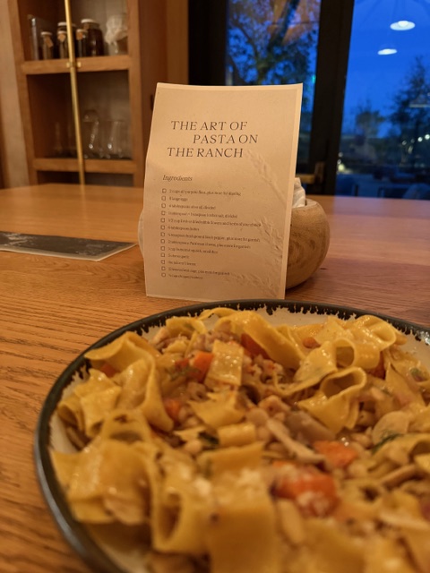 Although we had taken a pasta class in the past, the one we signed up for at Stanly Ranch differed, in a very good way. Starting in the Grange, the head gardener, Jason guided us through the property’s raised beds, educating us on everything from plant genus names to weather conditions needed for the produce to thrive. Along the way we picked fennel, oregano, rosemary, bachelor buttons, and crimson fava bean flowers to use in our creations.