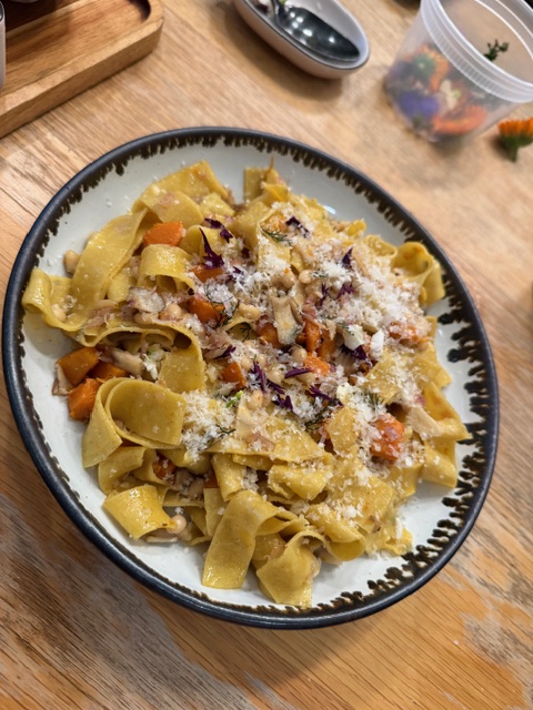 After threading each of our pieces through the pasta machine four times, we folded them into thirds, then cut them into half-inch strips. The result? Pretty strands of fettuccine! While a pot of water boiled to cook the pasta, we focused on the sauce. And what a sauce it was! Not tomato, but a blend of butter, garlic, shallots, butternut squash, mushrooms, pine nuts, parmesan cheese, and lemon. As it simmered, the room filled with luscious Italian aromas. Citrusy, floral, and spicy. It was like being enveloped by a warm summer breeze on a lazy Mediterranean afternoon. Then, it was time for the finale. Like the last movement of a symphony, with our al dente pasta in bowls, we sprinkled more cheese, herbs, and flowers on top. Bellissimo!