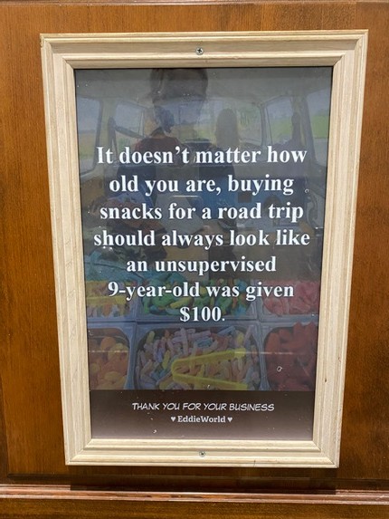 Eddie World has every right to boast about all it offers, but what I like best are the light, bright, and oh so clean restrooms! In the Women’s Restroom, a sign on the inside of each partitioned stall door reads: “It doesn’t matter how old you are, buying snacks for a road trip should always look like an unsupervised 9-year-old was given $100.” Ha! I like this thought. I like it a lot! I also understand in the Men’s Restrooms are mini game systems above the urinals. Imagine that?!